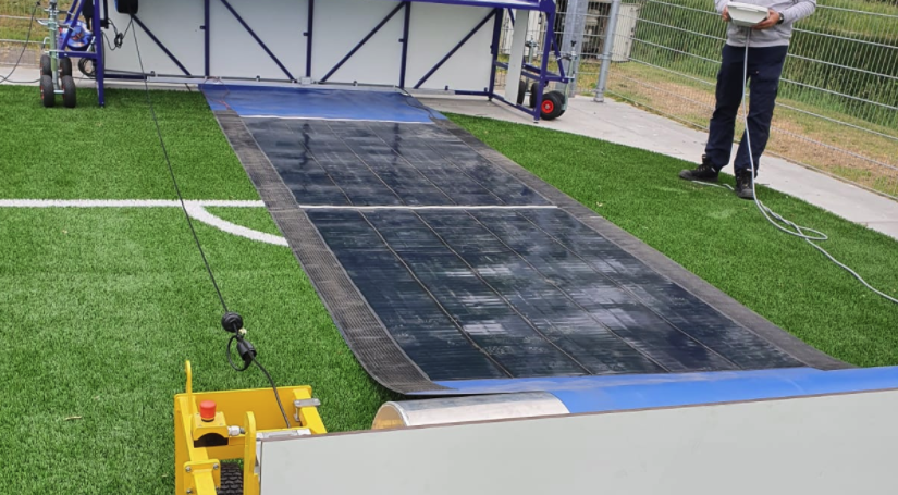 Een module is 4 meter breed en 20 meter lang. “Het plan is om dit op te schalen naar 70 meter.” Uit- en oprollen gebeurt nu nog met een afstandsbediening en duurt ongeveer een halve minuut, vergelijkbaar met de snelheid van langzaam wandelen. “In de volgende fase willen we het uit- en oprollen volledig automatiseren, zodat er helemaal geen mensen meer aan te pas komen.” De grote vraag is natuurlijk: hoeveel stroom kun je met zo’n oprolbaar zonnetapijt opwekken? “Stel, je legt een heel sportveld vol, dat levert genoeg energie op om zo’n 180 huishoudens van stroom te voorzien.”