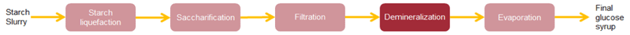 Een van deze raffinagestappen is ionenwisseling, een demineralisatiestap waarbij wij onze verdunde siropen demineraliseren met behulp van kation- en anion harsen. Het hele proces wordt weergeven in het onderstaande schema: