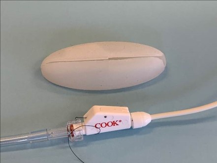 Afbeeldingen van de SoftKees in gebruik door een patiënt (links) de SoftKees los als product (midden) en de nierdrain zonder de SoftKees (rechts).