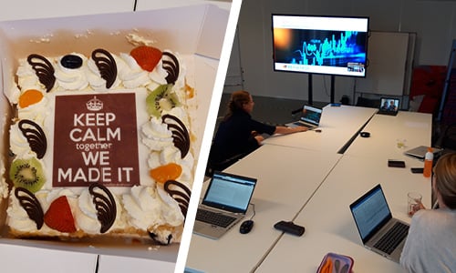 Het moment dat het ontwikkelteam voor het eerst (na zes weken alleen maar digitaal contact) op veilige afstand samenkomt tijdens de evaluatie - daar hoort natuurlijk taart bij!