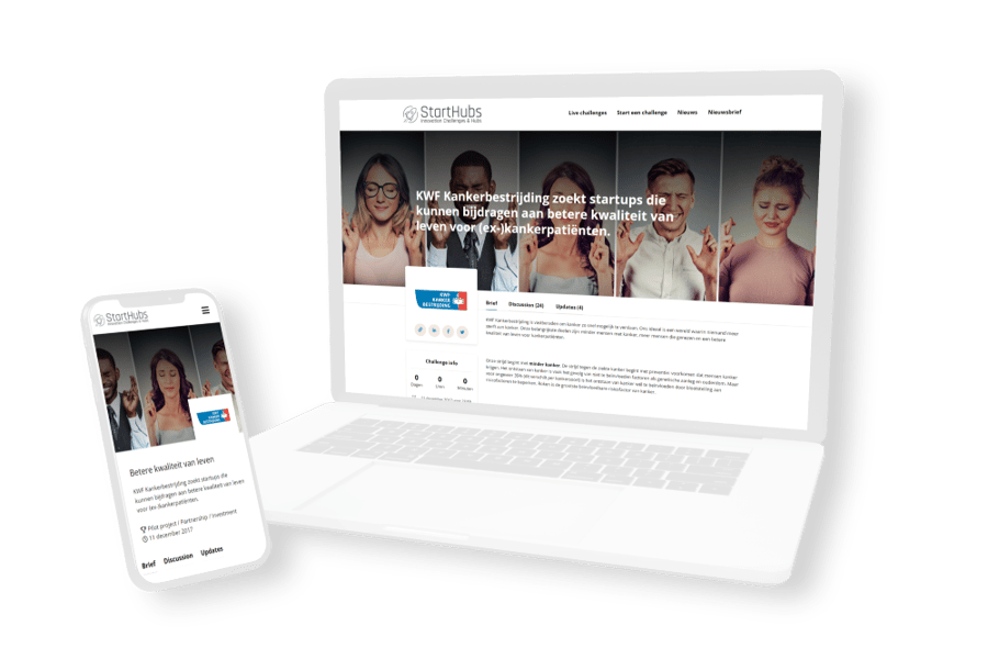 Voor deze challenge kreeg KWF een eigen pagina op Starthubs.co, hét open innovatieplatform voor onze ambitieuze ondernemerscommunity. Naast de challenge pagina kunnen organisaties kiezen voor een eigen challenge website (eigen domein en huisstijl) en een promotiecampagne voor extra bereik!